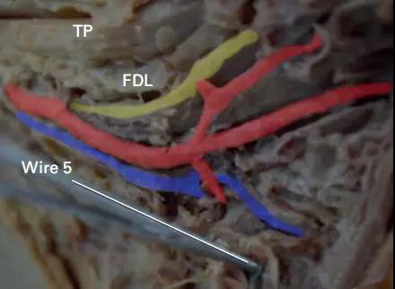 图4 置入克氏针后解剖内侧视图显示胫后神经血管束。黄色:胫后神经。红色:胫后动脉。蓝色:静脉