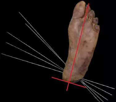 图3 足底的标准照片用以计算克氏针与冠状面的交角,按照解剖轴线画垂直线(红线)。