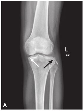 A. 膝关节 X 线前后位片。白色箭头示反 Segond 骨折。黑色箭头显示胫骨平台外侧及腓骨头骨折。B. 膝关节 MRI。矢状位 PDWI:ACL 和 PCL 损伤后胫骨水肿;C. 冠状位 T2WI:胫骨平台内侧撕脱性骨折(反 Segond 骨折)和胫骨平台外侧撕脱骨折