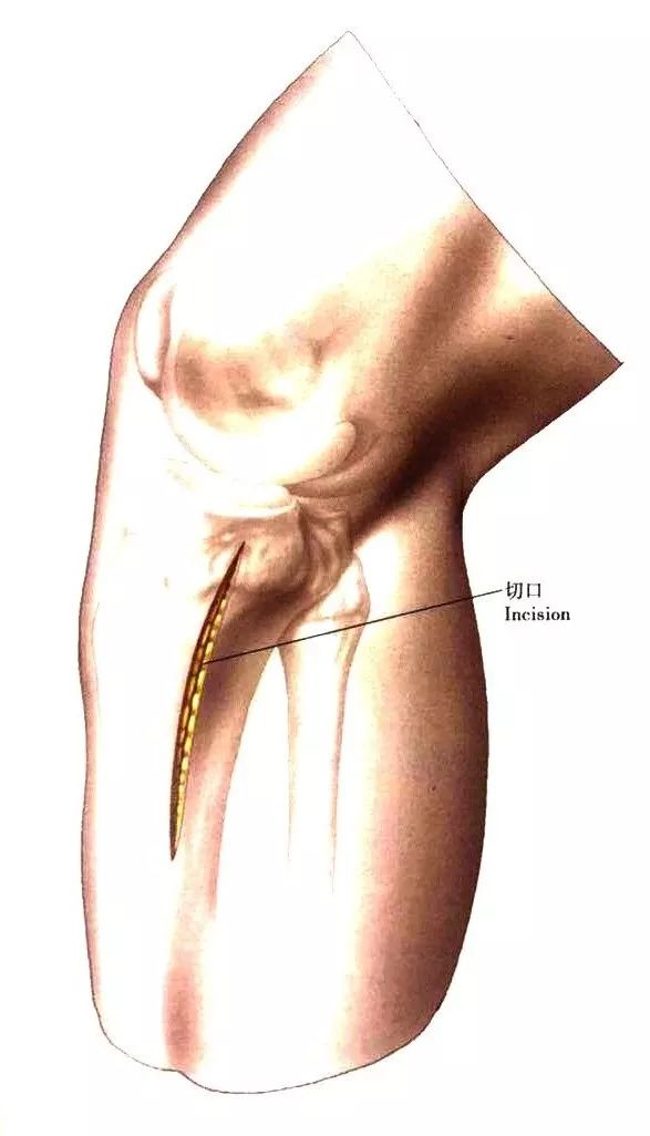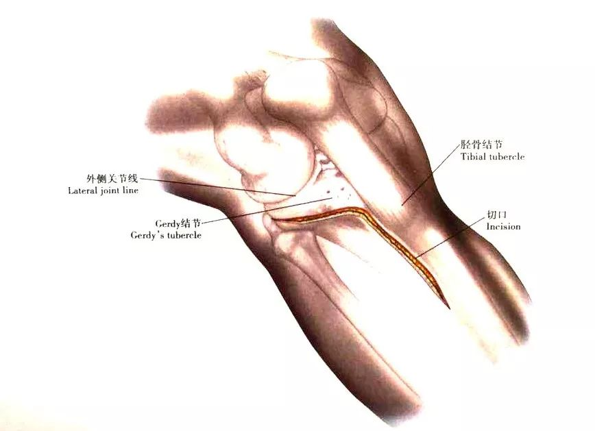 图2做一S形切口,起自关节线近端约3~5cm,恰好位于髌腱边缘的外侧,孤形向前越过Gerdy结节,在胫骨前缘外侧约1cm处向远端延长切口。
