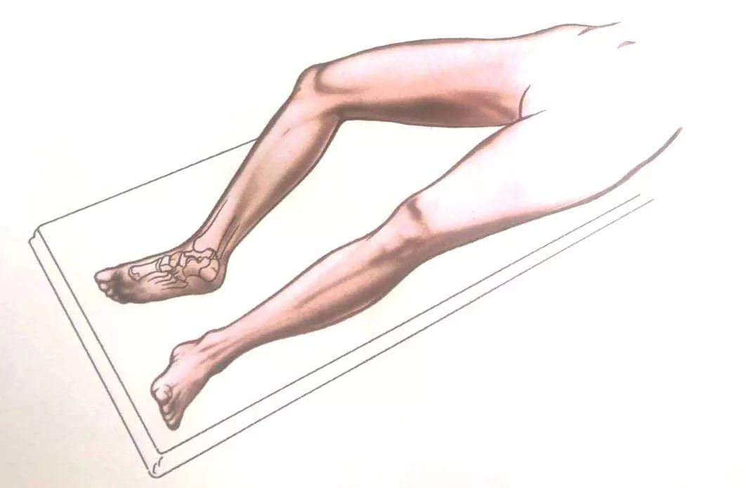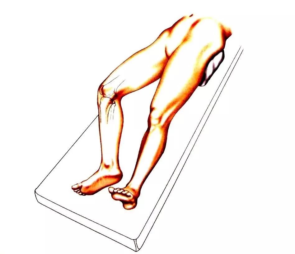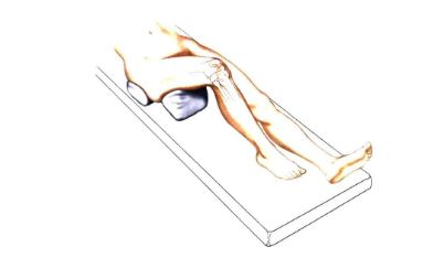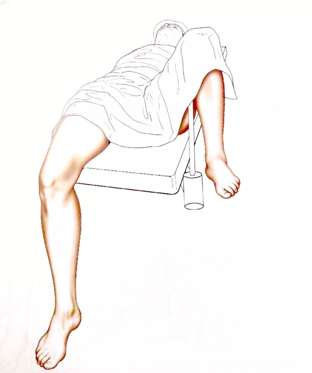 这是最常应用的体位。患者仰卧于手术台上,屈髋60°,在大腿远端后面放一个支撑物。注意不要将支撑物放在腘窝处,以免对腘静脉产生压力(见图12、图13)。