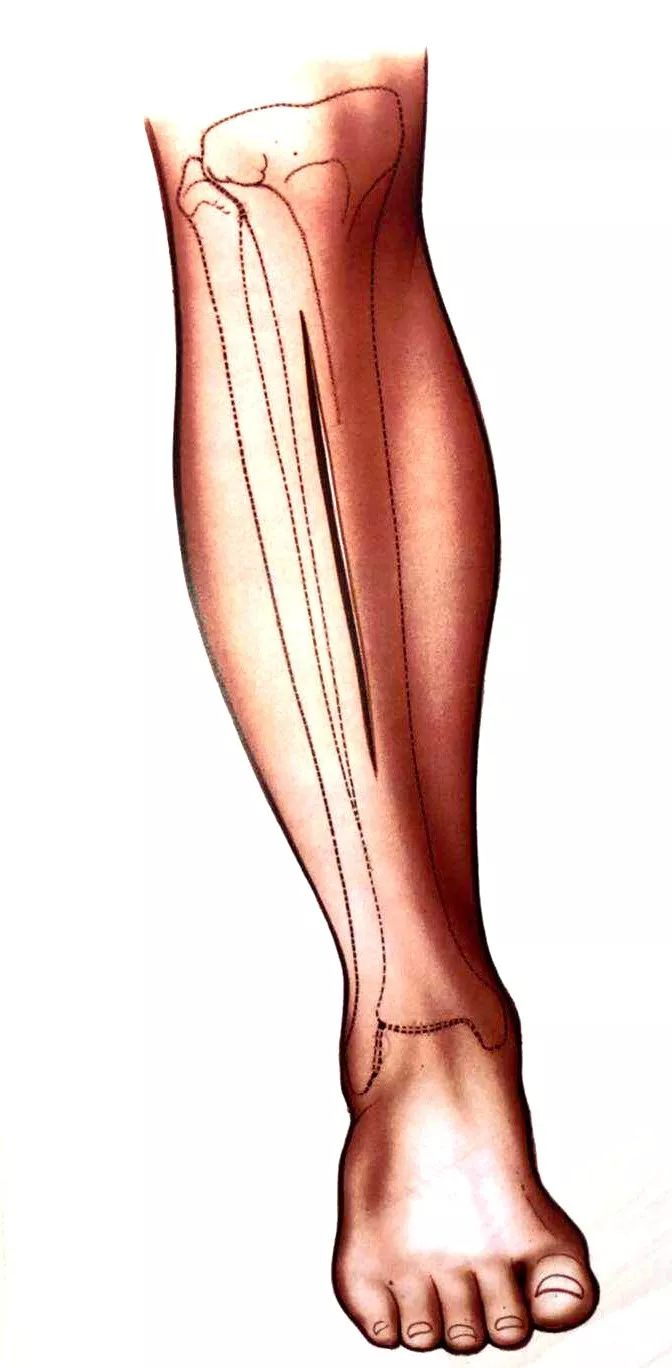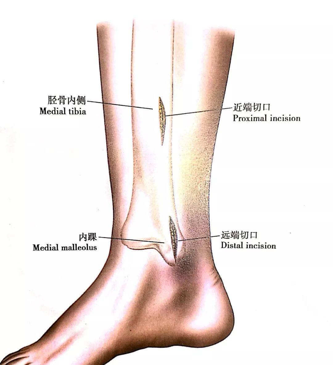 图9在远端,做一长约3~4cm的切口,起自内踝远端,并在胫骨前后缘之间的中线上沿胫骨的皮下面向近端延长;在近端,于胫骨前后缘之间的中线上沿胫骨皮下面做一纵向切ロ。