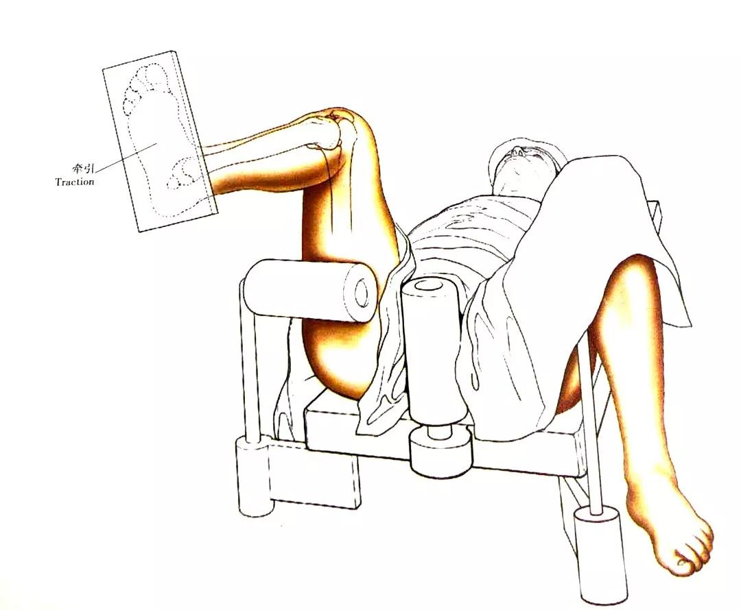 图12牵引手术台体位。屈髋60°,屈膝100°~120°,通过将患者的足捆绑到牵引底进行牵引。将对侧小腿放置于一个支撑物上,将髖关节屈曲外展,膝关节屈曲。