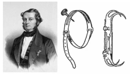 1840年,著名的法国医生让 · 弗朗索瓦 · 马盖涅(Jean-François Malgaigne)发明了一套体外经皮复位装置,方法是将一个半环状的铁圈用皮带绑在小腿上,然后收紧皮带,使得铁圈上的金属针刺入胫骨骨折端,调节皮带的松紧度,直到骨折达到满意的复位为止。这种方法由于引入了经皮侵入骨折端、直接操作骨折断端的做法,标志着外固定支架在希波克拉底方法上的一大飞跃,从此外固定支架告别2000年来的古代理念,进入近代发展阶段。1843年马盖涅医生还发明了经皮抓髌装置(下图右),这一理念被一直沿用至今。