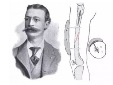几年后,比利时安特卫普的Albin Lambotte医生在Parkhill的基础上推出了一个改良型的装置。与Parhill不同的是,他将四枚骨针用两块厚重的钢板夹固,变外固定支架为刚性装置,使得患者可以在伤后早期活动,这种做法一举奠定了现代外固定支架 “经皮置钉、体外刚性连接” 的理念基础。