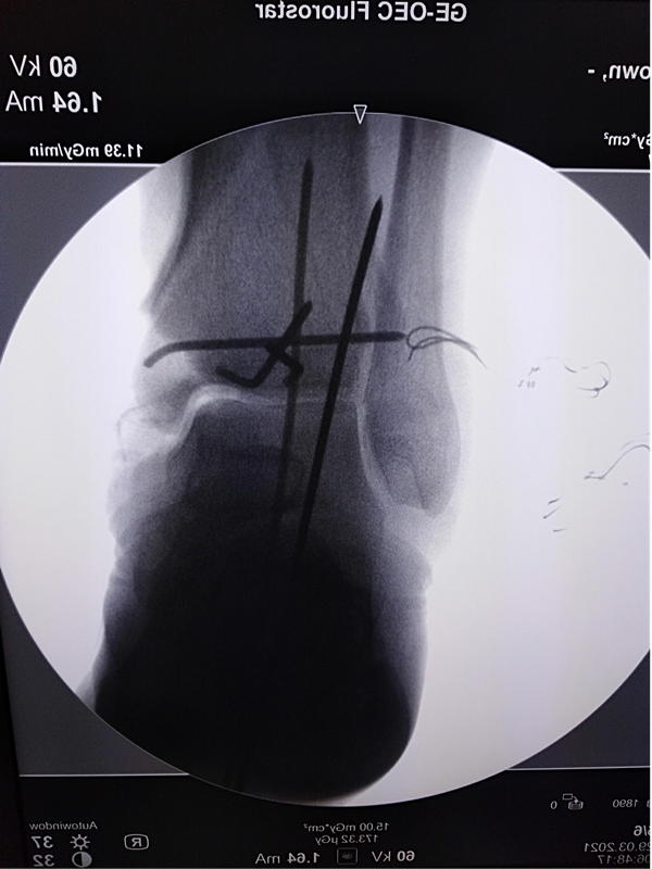 该患者车祸伤入院,入院查体可见右内踝皮肤缺损面积约5cm*10cm,右足背部皮肤脱套伤,内踝缺如。患者既往高血压、糖尿病,一直服用利血平及阿司匹林。利血平一般建议停用2周,阿司匹林建议停用1周方能进行麻醉。不手术,患者开放性损伤,持续流血状态,失血过多会发生生命危险。手术的话,服用利血平有术中发生血压不能维持,呼吸心跳骤停的风险。麻醉医师团队及创伤骨科医师团队面临双重风险,两害相权取其轻。患者开放性损伤,时间就是生命。面对困难,勇于承担,经患者及家属同意,第一时间进行了第一次清创+外固定支架固定+VSD负压引流手术。后续又进行了第二次清创+外固定支架调整+抗生素骨水泥链植入+克氏针固定踝关节骨折+VSD负压引流手术。第三次清创+骨折复位螺钉内固定+内踝重建+Ilizarov环形外固定固定+VSD负压引流手术。手术均进行顺利。