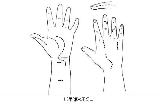2.切口 常用掌、指骨折切口如图所示[图2 图示的掌骨切口最适用于相邻的两根掌骨,单一掌骨骨折可将切口移至伤骨背侧的伸肌腱侧面。指骨骨折可以根据骨折的部位,选用其中的一段。