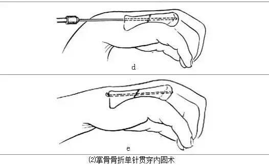 4.复位和内固定 掌、指骨骨折复位比较容易,手法牵引,加骨膜剥离器撬拨,即可复位。复位后,常用克氏针内固定,其方法有:
