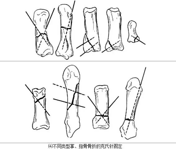 双针交叉固定最适用于指骨干横折。其他部位骨折和不同类型骨折的克氏针固定如图所示[图2