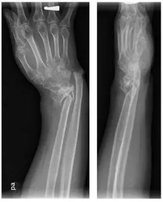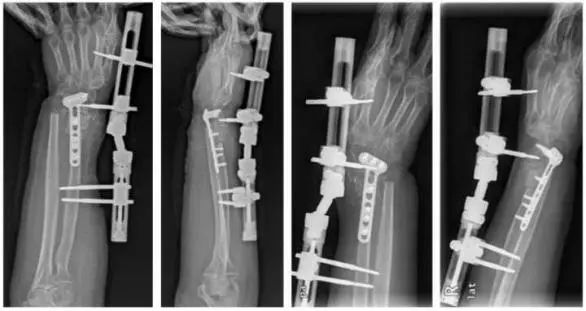 2.由于外固定支架的持续牵引作用,可避免骨折的再次移位,并保证掌倾角、尺偏角的恢复。