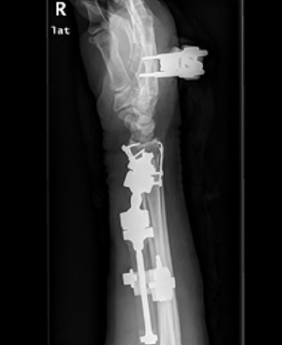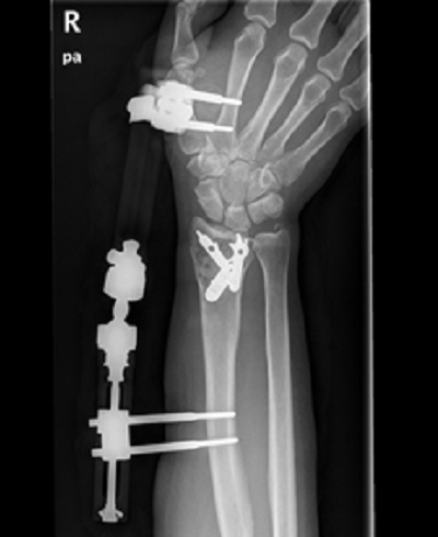 治疗:骨不连假关节处植骨融合钢板内固定,尺骨短缩,单边外固定器固定。因桡腕关节已融合,故将单边外固定器反向应用。