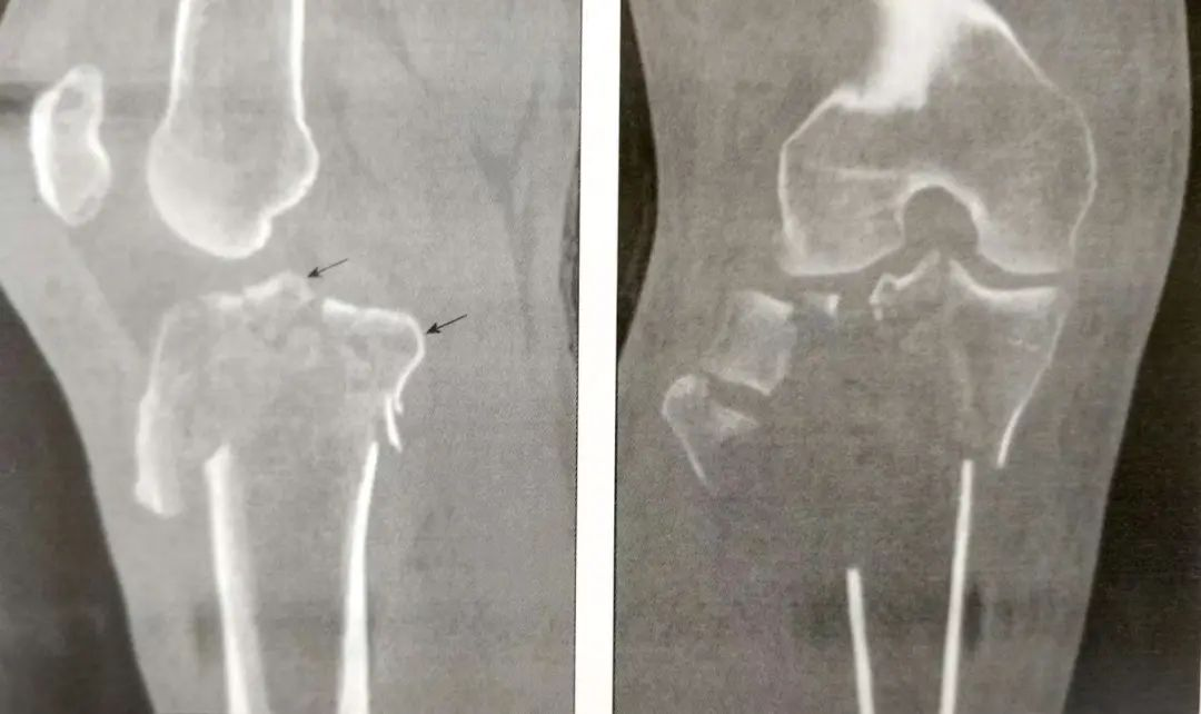 非重建治疗用于严重损伤无法解剖复位的患者,适合采用全膝关节置换的患者,不能行走的患者,软组织损伤严重的患者。这些患者可以使用外固定支架或者夹板治疗。