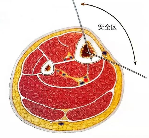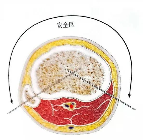 安全区位于腓骨外侧到胫骨内侧中部。克氏针和钢针不能越过安全区。