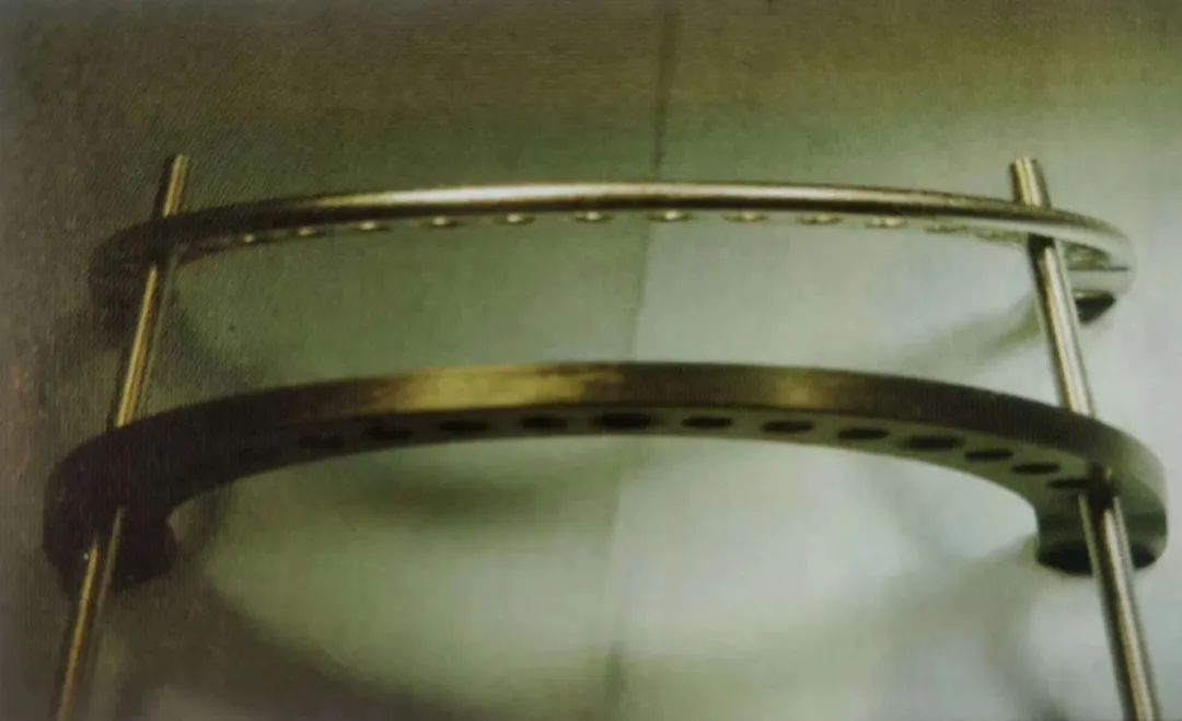不同的环形外固定架厚度不同,伊利扎诺夫系统的碳纤维环(下)比金属环(上)要厚。