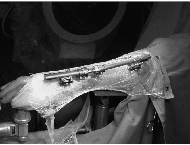 桡骨远端不稳定骨折是主要的手术指征,包括:①桡骨远端背(掌)侧皮质粉碎,关节面移位>2mm;②掌倾角向背侧倾斜超过20°~25°;③桡骨短缩> 5mm;④复位后不稳定,易发生再移位。骨折在纵向牵引下骨折块复位困难,骨折端的骨皮质支撑不满意,在骨折端夹有肌腱或骨膜。对于严重的关节内粉碎骨折,桡骨短缩明显,内固定螺钉无有效固定位置的病例,外固定架固定是首选方法。如Frykman分型中的Ⅶ、Ⅷ两型,通用分类法中的Ⅱ、ⅣA、ⅣB型,关节内四部分骨折等首先应考虑外固定架。此患者桡骨远端背侧皮质粉碎,复位后不稳定,易发生再移位。腕背侧移位的骨片闭合复位很难达到满意的位置。
