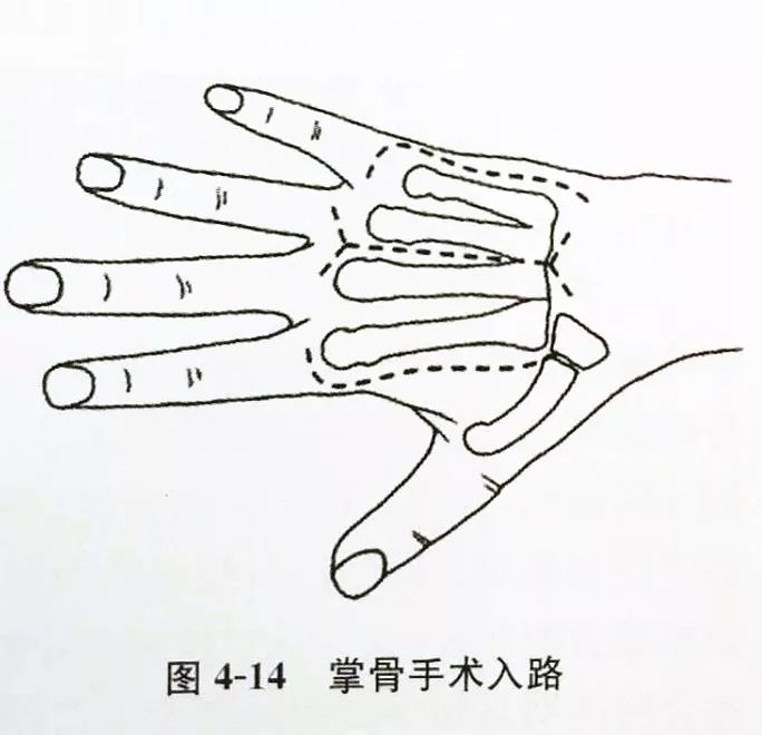 掌指骨骨折的手术入路比较简单,一般都采用背侧切口入路,如图4-14。第二掌骨的切口偏桡侧而第五掌骨 切口偏尺侧,第三、四掌骨常取中间切口入路。如遇相邻的两块掌骨同时手术时,则取中间S形切口,兼顾两个手术部位。