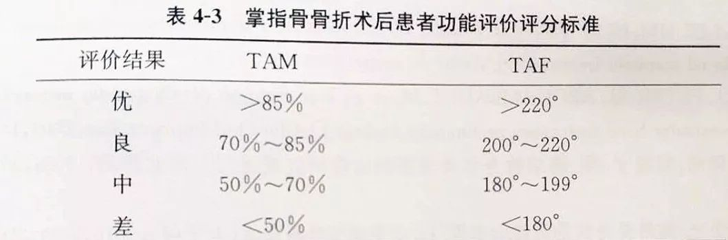 2、功能评价:掌指骨骨折患者术后的功能评价,通常有手指总主动活动度TAM( total active motion)及手指总主动屈曲度TAF( total active flexion)两种评分系统。而对于关节内骨折尚需测量关节的活动度,并与健侧相应的关节进行对比,求其百分比来综合评估,如表4-3。