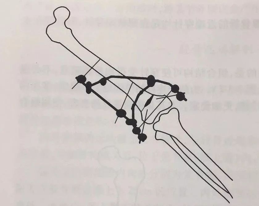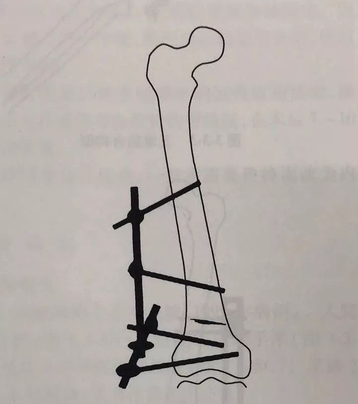 有时在股直肌和骨外侧肌间隙穿针,与弧形弓连接固定。短期使用,使早期构型更加稳定。