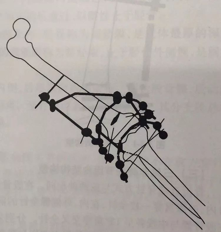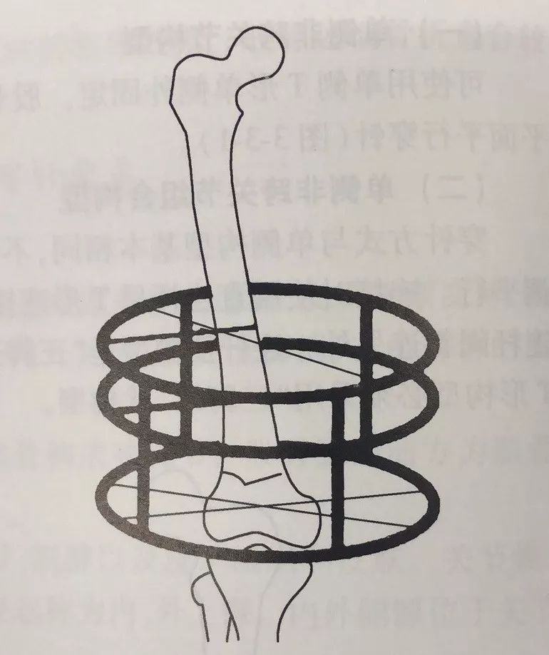 骨折近端穿针方式与前两种相同。在股骨髁(当远端骨折段较长时在髁上),采用经股骨内、外髁贯穿一枚全针,在内、外侧髁全针的前或后方星30°-45°角再穿各一枚半针;也可在股骨与中线各呈15°角穿交又全针。分别采用单侧连杆连接固定骨折近端半针,半环弓或类半环弓连接股骨髁穿针;外侧直连杆与股骨髁弧形弓连接;弧形弓连接外侧直连杆近端和半环弓内侧,组成三维构型(图3-33)。