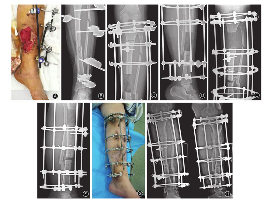 图2 男,22岁,车祸伤致左小腿开放性骨折 A 外固定架固定术后1个月,大体照片示左小腿中段内侧9 cm×8 cm皮肤缺损区,伴感染死骨形成 B 术前正位X线片示左胫骨无愈合征象 C,D 骨搬移术后1周,左胫骨正、侧位X线片示骨缺损约10 cm E,F 骨搬移术后4个月,正、侧位X线片示延长骨段矿化良好,断端对合,下肢力线无明显偏移 G 小腿内侧创面给予开放换药,骨搬移术后4个月大体照片示创面完全愈合 H 骨搬移术后9个月,正侧位X线片示骨搬移断端对合良好