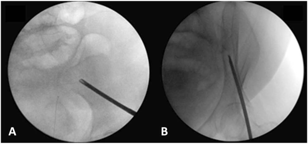 图1所示。A.髂骨斜位X线片显示斯氏针位于坐骨支。B.闭孔斜位X线片显示斯氏针位于髂骨的内外板间。