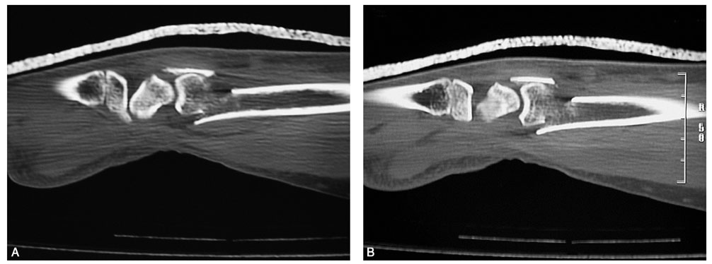 术前拍腕关节正、侧位X线片,腕关节冠状位、矢状位和水平位CT(图2-2)此患者骨缺损和无法闭合复位的骨片均在背侧,宜采用背侧入路,复位,植骨,固定。取患肢前臂远端桡背侧纵切口(图2-3)从伸拇长肌腱和桡侧伸腕长、短肌之间进入,注意保护血管神经和肌腱,显露清理折端骨缺损区域和背侧移位的骨片(图2-4复位,植骨,外固定架超关节固定(图2-5、图2-6)。术中透视骨折复位固定满意(图2-7),术后拍X线片证实(图2-8)。此手术的优点在于避免了局部存在内固定物的刺激,避免二期切开取出固定物所致的再次损伤。