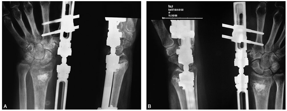术后抗炎3天,每日进行针道护理。术后第二天开始进行康复训练,指导下进行前臂旋转功能锻炼。术后第4周松开一侧外固定架的球形关节动力化,初步行腕关节屈伸功能锻炼。术后6周骨折愈合,去除外固定架。常见并发症主要有:桡神经损伤,肌腱损伤,肩手综合征,创伤性关节炎,针道感染,固定失效,畸形愈合,腕关节不稳定。此患者仅有轻微外背侧疼痛。