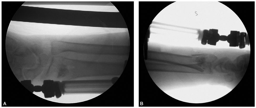 桡骨远端不稳定骨折是主要的手术指征,包括:①桡骨远端背(掌)侧皮质粉碎,关节面移位>2mm;②掌倾角向背侧倾斜超过20°~25°;③桡骨短缩> 5mm;④复位后不稳定,易发生再移位。骨折在纵向牵引下骨折块复位困难,骨折端的骨皮质支撑不满意,在骨折端夹有肌腱或骨膜。对于严重的关节内粉碎骨折,桡骨短缩明显,内固定螺钉无有效固定位置的病例,外固定架固定是首选方法。如Frykman分型中的Ⅶ、Ⅷ两型,通用分类法中的Ⅱ、ⅣA、ⅣB型,关节内四部分骨折等首先应考虑外固定架。此患者桡骨远端背侧皮质粉碎,复位后不稳定,易发生再移位。腕背侧移位的骨片闭合复位很难达到满意的位置。