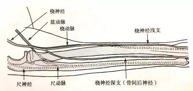 桡神经浅支在前臂上1/3位于肱桡肌的深面,下行与桡动脉伴行位于肱桡肌腱与桡侧腕屈肌腱之间,于前臂下1/3浅出至背侧。桡神经深支称骨间背神经,穿过旋后肌,绕过桡骨头,支配前臂伸肌(图1)。