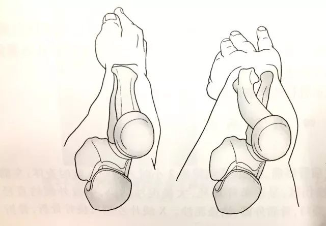 尺骨穿针时前臂应处于中立位(左);桡骨穿针时前臂应处于旋内位(右)
