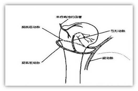 1.肱骨头血供由腋动脉发出旋肱前动脉和旋肱后动脉供应,主要从前外侧进入。