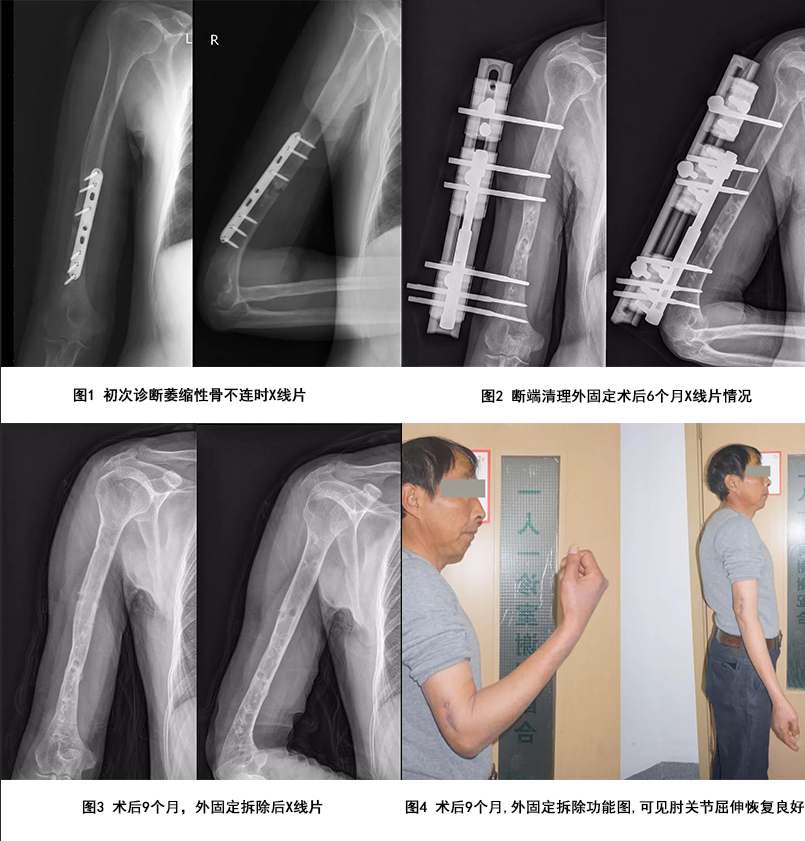 典型病例:患者,男,54岁。右肱骨内固定术后2年 余,2年后随访见断端出现萎缩性骨不连,通过内固定取出后单边外固定支架固定加压进行治疗。