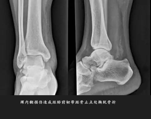 各类型撕脱骨折由于撕脱骨块较小或被重叠往往出现 X 表现的假阴性,另外由于患者不重视,未摄片检查以及采取不正当的处理措施,均容易遗漏撕脱骨折及韧带损伤的诊断。