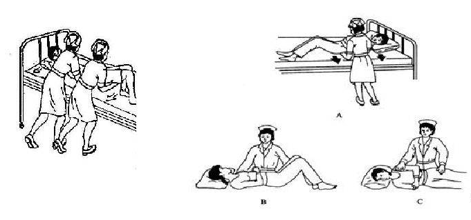 1、一人翻身法:护士立于病床一侧,双手托扶住病人的肩部及臀部,将病人翻转成侧卧位,面朝向护士,然后移一手扶住病人的腰背部,另一手拿枕垫于病人肩背部,使病人上身略向后偏靠,下腿稍微屈膝,上腿屈髋屈膝位,两膝盖间夹一软枕,此方法适用于腰椎手术后的翻身。