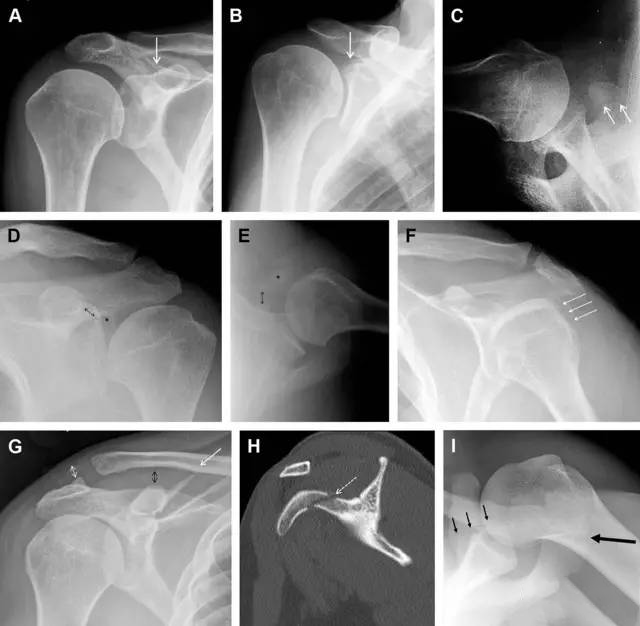 其中喙突基底部骨折最多见,常发生于直接暴力或肱骨头前脱位,骨折可延伸至关节盂。