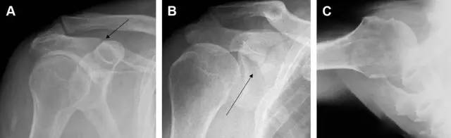 图 肩峰骨折。内旋位前后位(A)片上,骨折线几乎被喙突完全遮挡, 但是在标准前后位(B)和腋位(C)片上可见骨折线