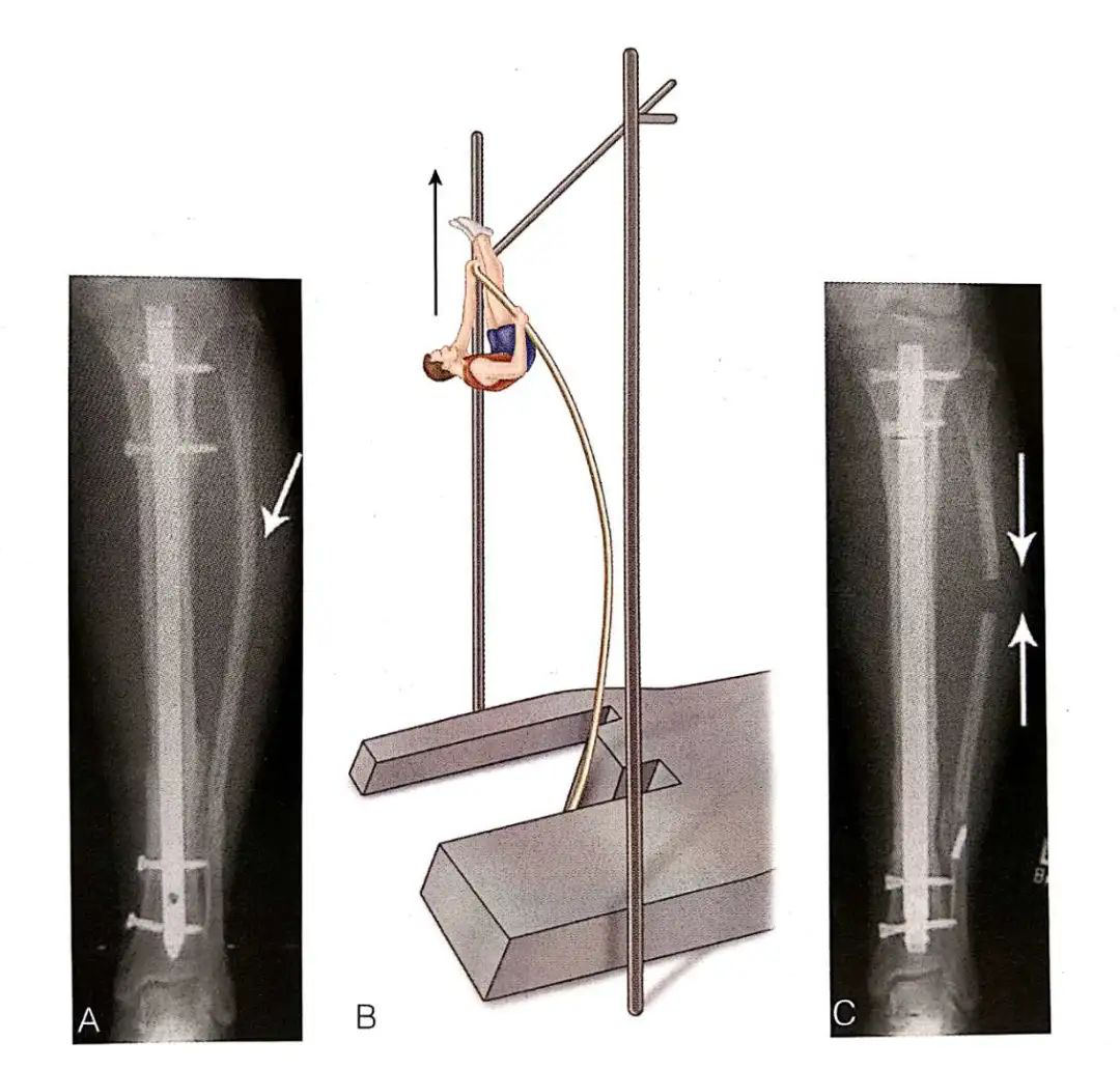 B:轴向负荷足以损坏螺钉。弓形的腓骨可能提供一个分离的力量,类似于撑竿跳的反弹力,这可能是导致骨折愈合失败的原因。