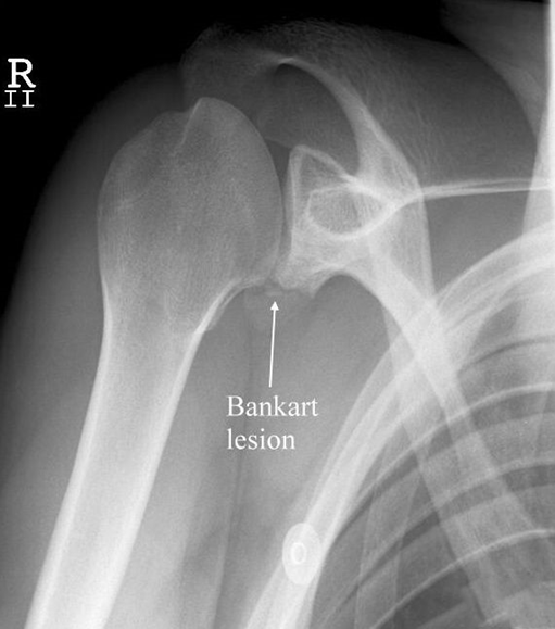 bankart 骨折指肩关节盂前下边缘骨折,伴或者不伴有肩关节前脱位。是肩关节盂唇前下方在前下盂肱韧带复合体附着处的撕脱性损伤。因肩关节前脱位引起,是造成习惯性前方不稳定和脱臼的基本损伤。