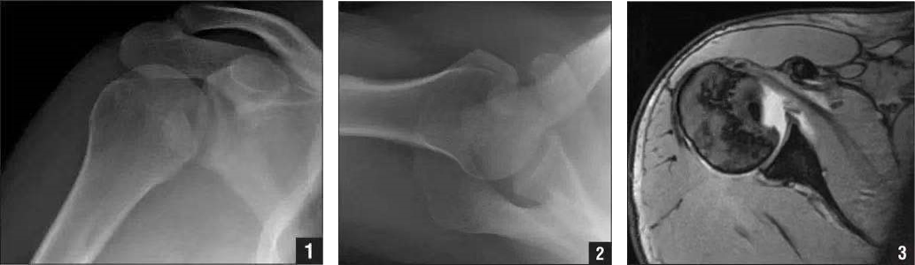 1. 正位片示肱骨头损伤;2. 侧位片示反 Hill-Sachs 损伤;3.MRI 示反 Hill-Sachs 损伤程度。