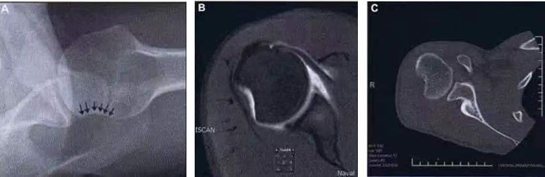A.Hill-Sachs 损伤的 X 片;B.Hill-Sachs 损伤的 MR 片;C.Hill-Sachs 损伤的 CT 片。