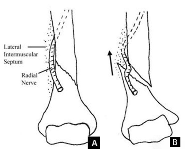 肱骨远端 1/3 骨折伴桡神经嵌压。