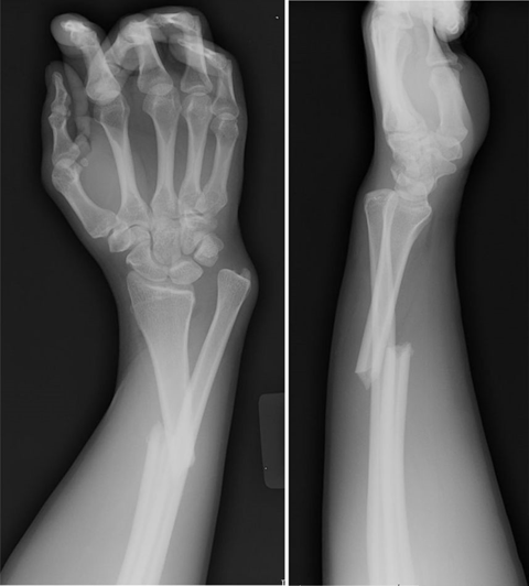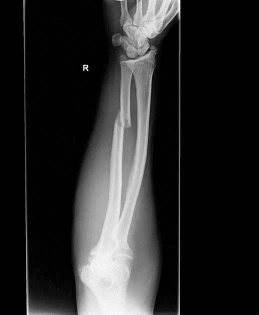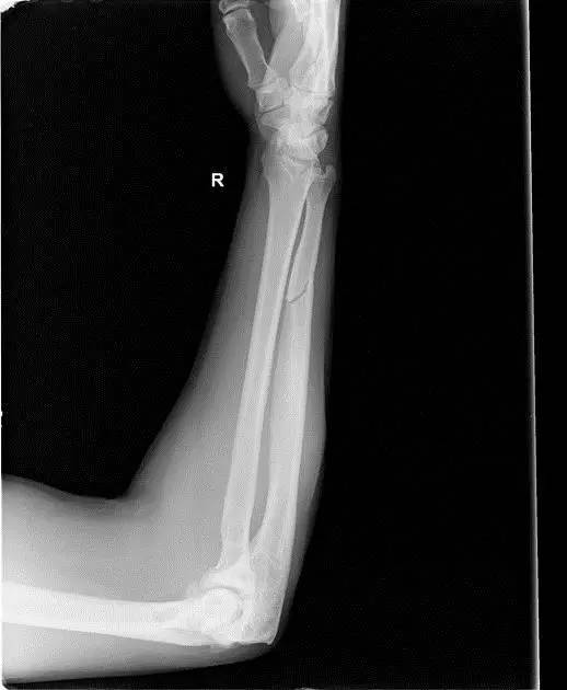 直接外伤造成尺骨单骨折。前臂单纯的尺骨骨折,通常是由钝伤造成。Nightstick 的意思是警棍,此伤害可因受到棍击时举起手来抵挡产生。