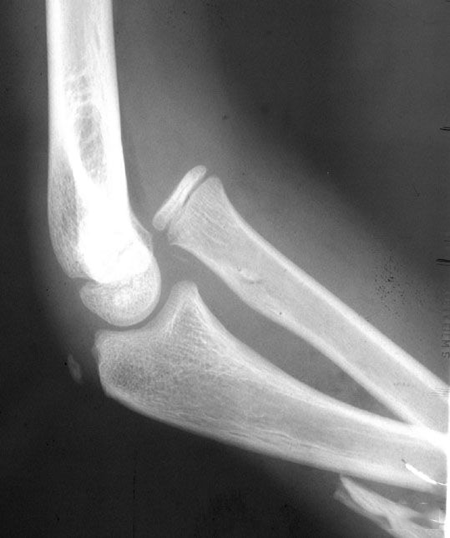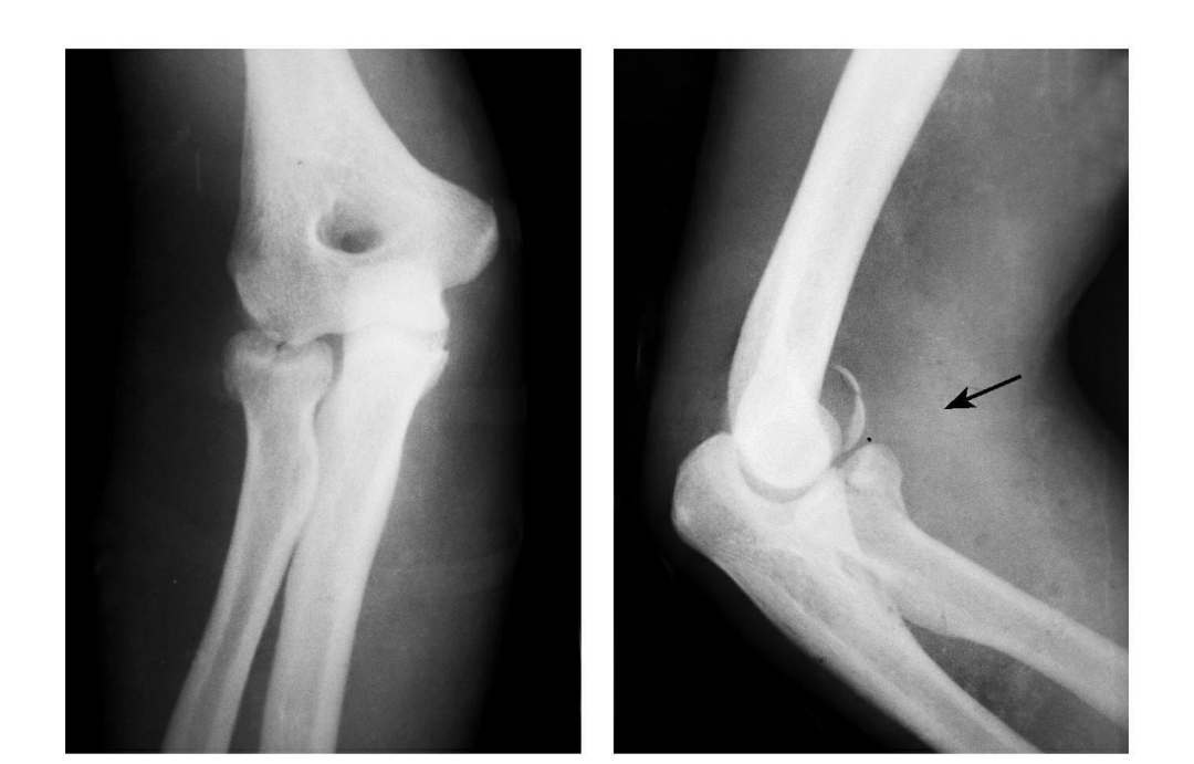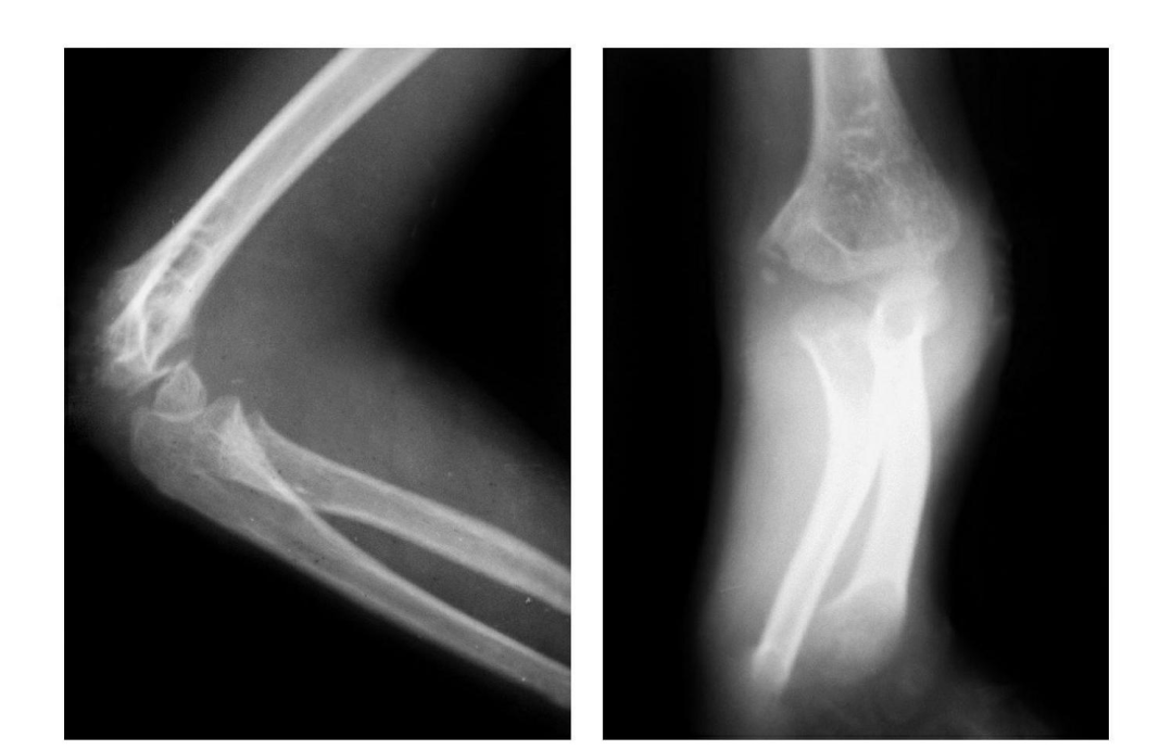 例 2:肱骨小头软骨面剥脱性骨折,致该小头新月状骨片被向前脱位的桡骨头顶向肘关节前上方,并尺骨干中段骨折(孟氏伸展型骨折)。