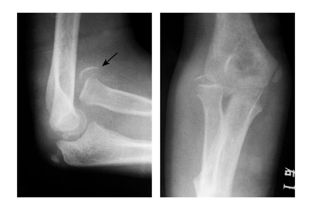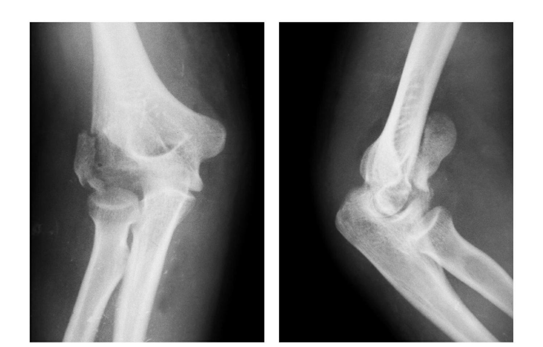 例 1:肱骨小头软骨面及其下方少量骨质呈“新月样” 被剥脱,且向肘前上方移位并桡骨头前半部骨折。