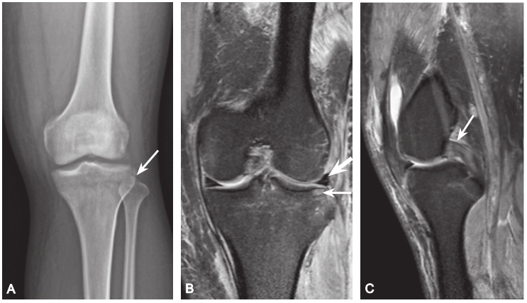 A. 膝关节 X 线前后位片,胫骨平台外侧缘撕脱椭圆形小碎骨片,长轴平行于胫骨,见侧囊征(箭头);B. 同一患者 MRI 冠状位 PDWI SPAIR 显示胫骨平台外侧缘撕脱骨折(细箭头),内外侧半月板内横形高信号,提示损伤(粗箭头);C. 矢状位 PDWI SPAIR 中间层面 PCL 显示肿胀,信号不均,提示 PCL 水肿,呈轻度损伤(箭头)
