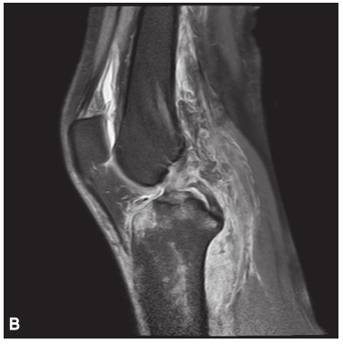 A. 膝关节 X 线前后位片。白色箭头示反 Segond 骨折。黑色箭头显示胫骨平台外侧及腓骨头骨折。B. 膝关节 MRI。矢状位 PDWI:ACL 和 PCL 损伤后胫骨水肿;C. 冠状位 T2WI:胫骨平台内侧撕脱性骨折(反 Segond 骨折)和胫骨平台外侧撕脱骨折