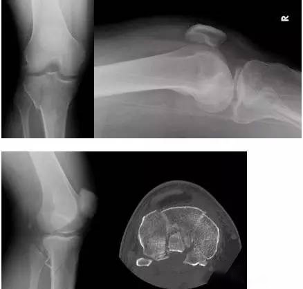 是汽车保险杠撞击膝关节外侧,导致的胫骨平台粉碎性骨折,伴有软骨面挫裂和腓骨头骨折。初诊,X 线上正侧位很容易忽略平台的粉碎性,CT 平扫及重建可明确伤情,MRI 可了解副韧带及叉韧带情况。