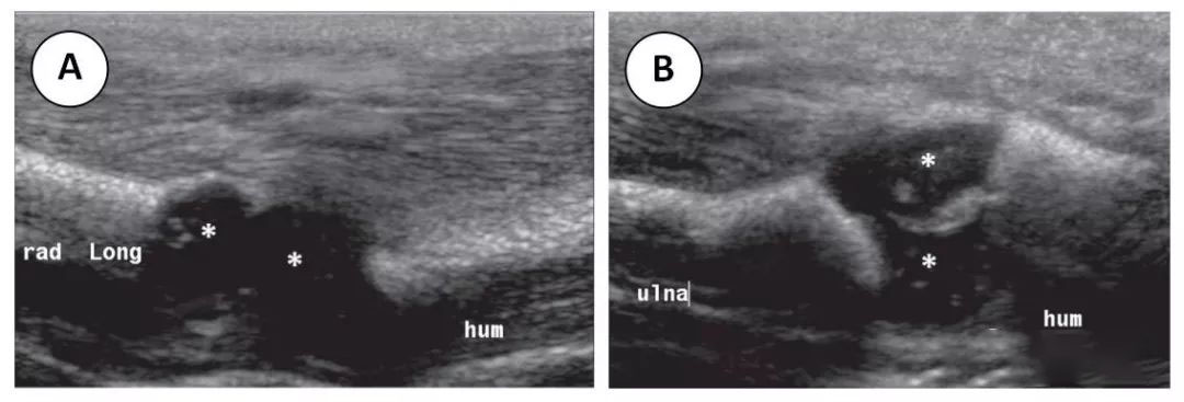 图 1 4 天大的婴儿出生后手臂肿胀。x 线片提示尺近端骨折。考虑到肘部未骨化的骨化中心,以及对 Monteggia 骨折脱位的关注,我们对肘部进行了超声检查。两个纵向灰度超声图像显示 (A) 正常的肱桡关节和 (B) 正常的尺骨滑车关节。肘关节未骨化的软骨骨化中心 (星号) 清晰可见。