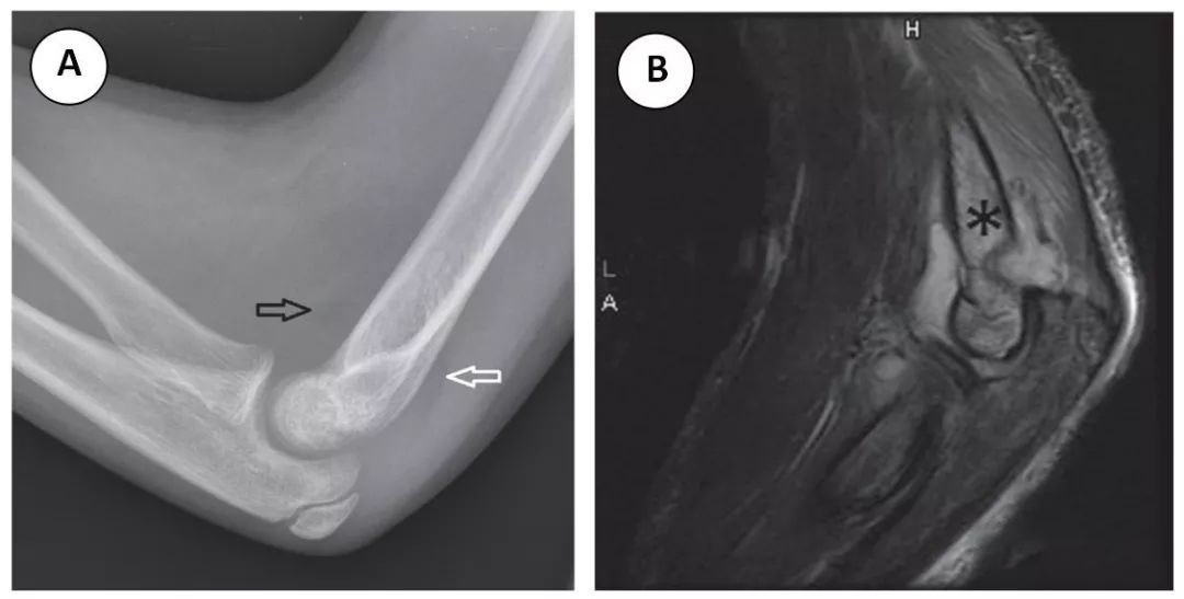 图 3 一名 7 岁男童跌倒后持续肘部疼痛。(A) 肘关节侧位片显示前脂肪垫(也称为帆船征)(黑色箭头) 和后脂肪垫 (白色箭头) 移位,提示肘关节中度积液。未见明显骨折线。(B)STIR 序列图像显示肘关节积液。此外,肱骨髁上可见骨髓水肿 (星号)。这些发现与影像学上的隐匿性骨折特征相符。
