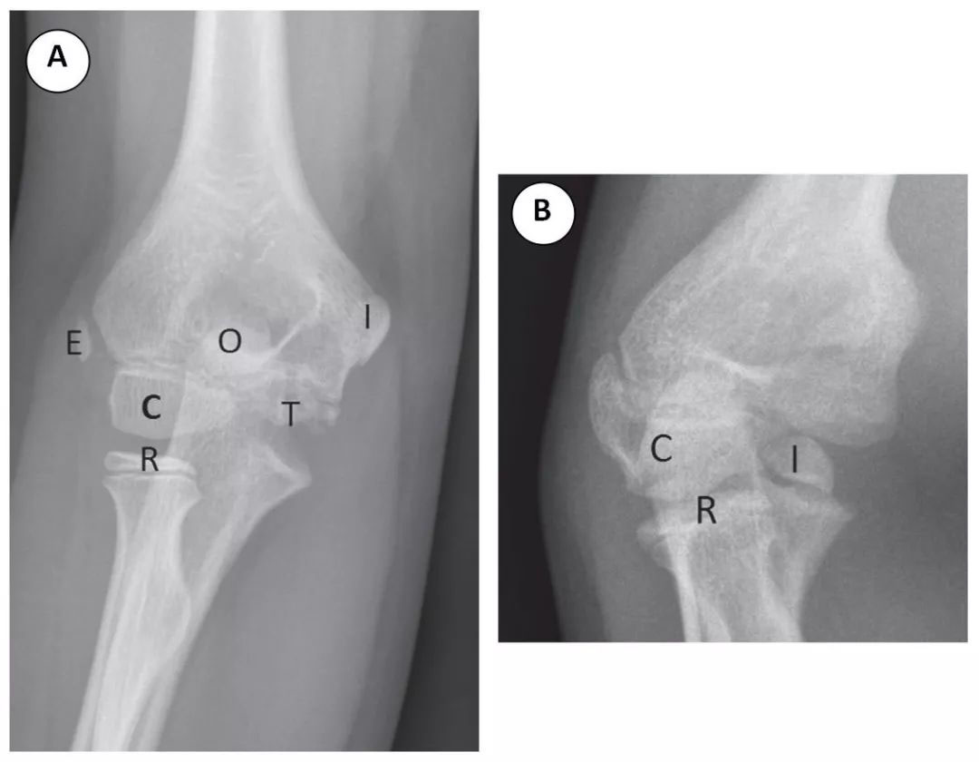 图 2 (A) CRITOE 是关于骨化中心外观可预测顺序的助记符。CRITOE 代表肘关节正位片上可见的肱骨小头 (C)、桡骨头 (R)、内上髁 (I)、滑车 (T)、鹰嘴 (O) 和外上髁 (E) 骨化中心。(B) 在肱骨滑车沟中注意移位的内上髁,不要将其误认为是肘关节前部可见的正常滑车骨化中心。